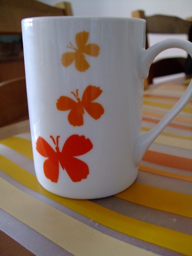 As they entered the apartment they were both struck by how it reminded them of the Truffaut one. Yellow and orange colour scheme, about the same size overall, the bedroom was arranged almost identically, there was a glass coffee table in each apartment with a guest book on it... these features weren't in every apartment they had stayed in. The 3 butterflies of Paris had also returned, this time on a mug which Kate would drink from...